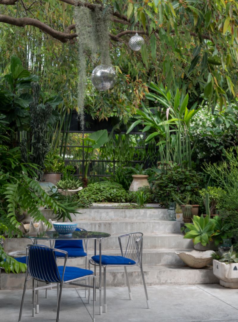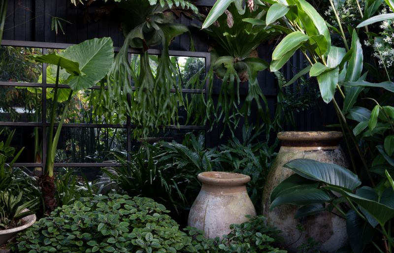 On the walls we planted creeping fig and star jasmine to green up the boundaries, as well as huge staghorn ferns. Cactus and succulent forms were included in the planting mix and they sit surprisingly well with the more subtropical plants, giving the garden a certain edge.