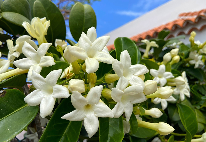 With clusters of waxy white blooms that release a sweet, jasmine-like scent, this climber is ideal for trailing along pergolas or archways. It thrives in a warm, sheltered spot with full sun to part shade and regular watering. Perfect for courtyards and covered patios, its glossy leaves and elegant fragrance add a touch of romance, especially on balmy evenings.