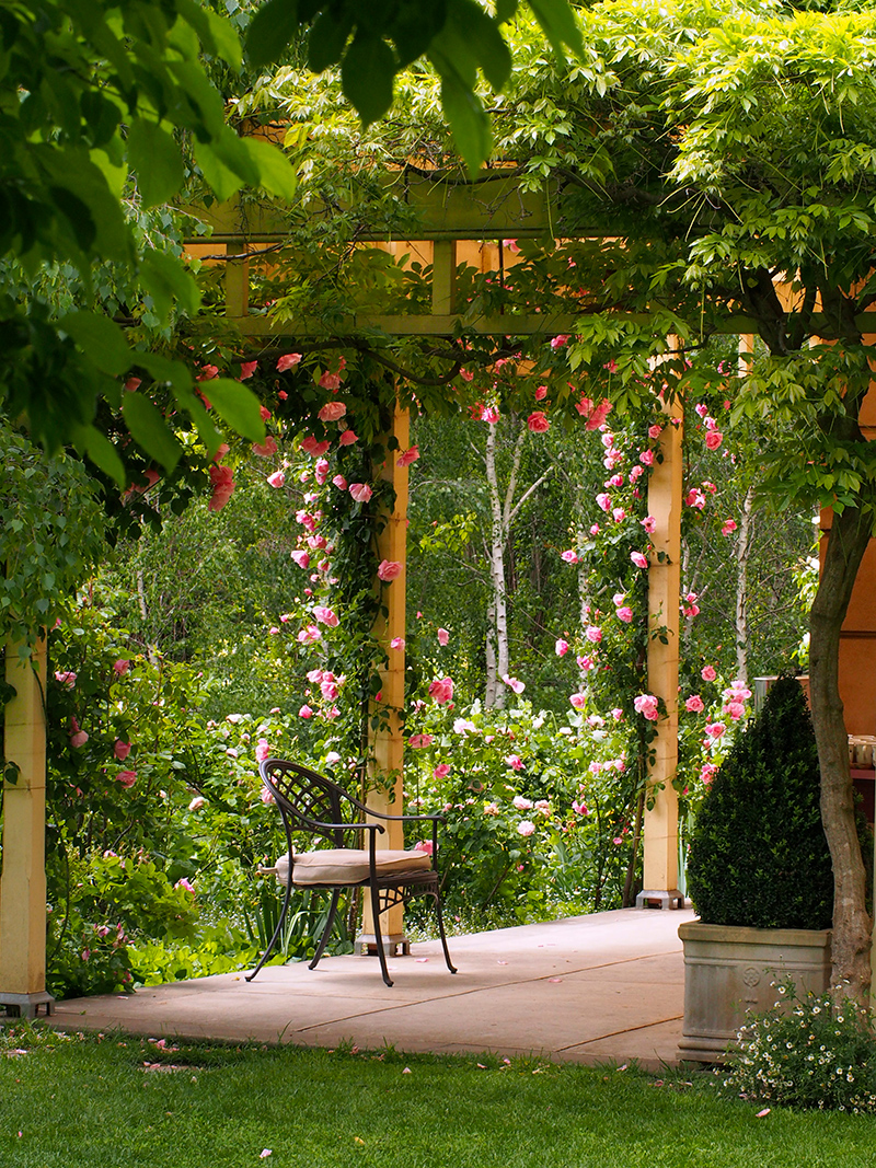 Train climbing roses up pergola supports to create a romantic canopy of lush, fragrant blooms. This adds height and structure while filling your garden with soft, fragrant charm and timeless beauty.