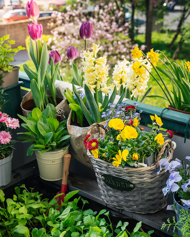 Use a mix of pots and baskets on your balcony railing to add layers of colour and texture without taking up floor space. Bright spring blooms like tulips, hyacinths and pansies instantly lift the mood.