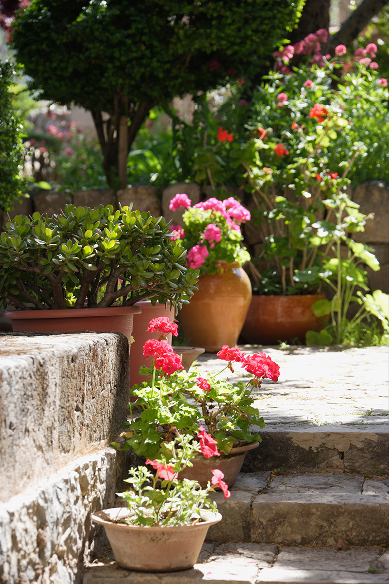Place pots at varying heights – from ground to ledges and shelves – to add depth and dimension. Use plants with different heights and textures to draw the eye upward, making small gardens feel more open, lush and full of life. This layered look adds structure, interest, and warmth to cosy spaces.