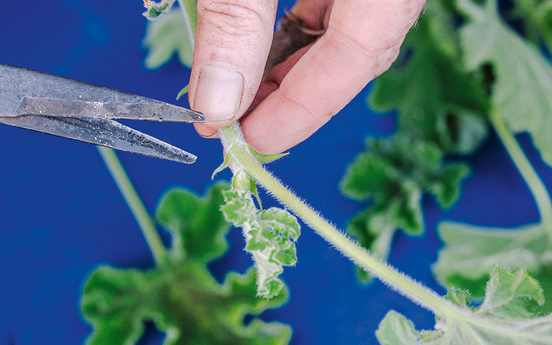 Create a cutting by cutting the stem below the node (leaf joint). Remove the set of lower leaves and trim the foliage down to about a third. Trimming excess foliage from the cutting can help reduce stress on the plant.