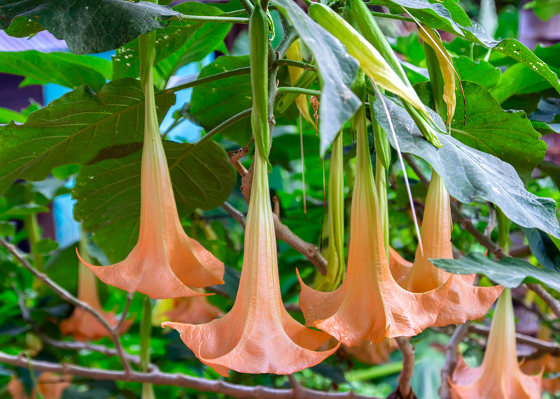 Brugmansias flower on new wood and respond to light pruning. They grow 4.5m tall, sometimes rangy and ratty, so if this isn’t ideal, pruning is an option. Aim for an umbrella shape by keeping a Y-shape and removing low side branches. Prune too hard and they send up long water shoots that don’t have much aesthetic appeal. Brugmansiahas had a bad rap due to its toxicity, but with careful handling there’s no reason to be afraid of it. Wear gloves and eye protection when pruning.
