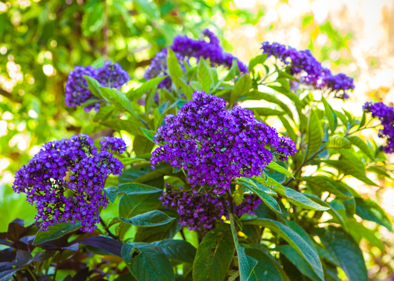 The common name comes from its perfume’s similarity to baked cherry pie and vanilla. Colours vary from quite pale to deep purple and the leaves too can have a purplish cast and be richly veined. Prune lightly in spring and through summer to keep the plant compact and avoid woodiness. It’s cold tolerant but not frost hardy and light, well-drained soil is best. Give protection from afternoon sun in summer to avoid sunburn. A single bush is quite nice but why not mass plant for a truly regal display.