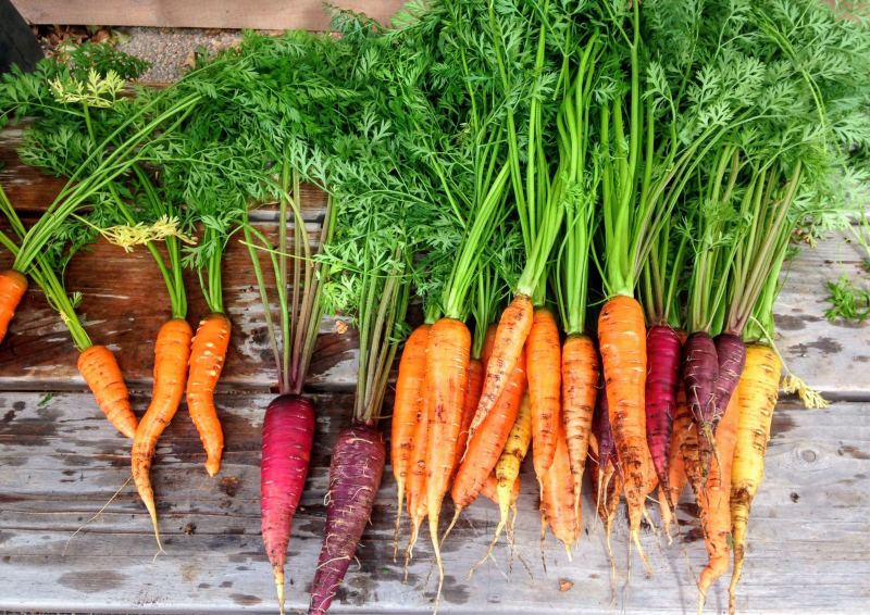 Carrots are best started from seed, sown directly where they are to grow. They dislike being transplanted. Carrots need soft and lump-free soil, at least 15-20cm deep, otherwise the roots can become crooked. For successful seed germination, sow thinly in rows about 6 mm deep. Water gently and cover the row with a plank of wood, lifting it daily to rewater. Lift the wood each day to rewater and as soon as the first seedlings emerge, remove the cover. This method helps maintain consistent soil moisture, promoting better germination. If there are too many seedlings, thin to give each plant 3-5cm of room to grow. Tender baby carrots can be picked in as little as 10 weeks.