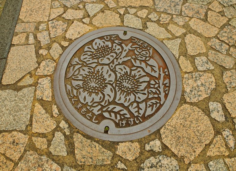 The Higo camellia, symbolic of Kumamoto City, adorns a a man-hole cover.