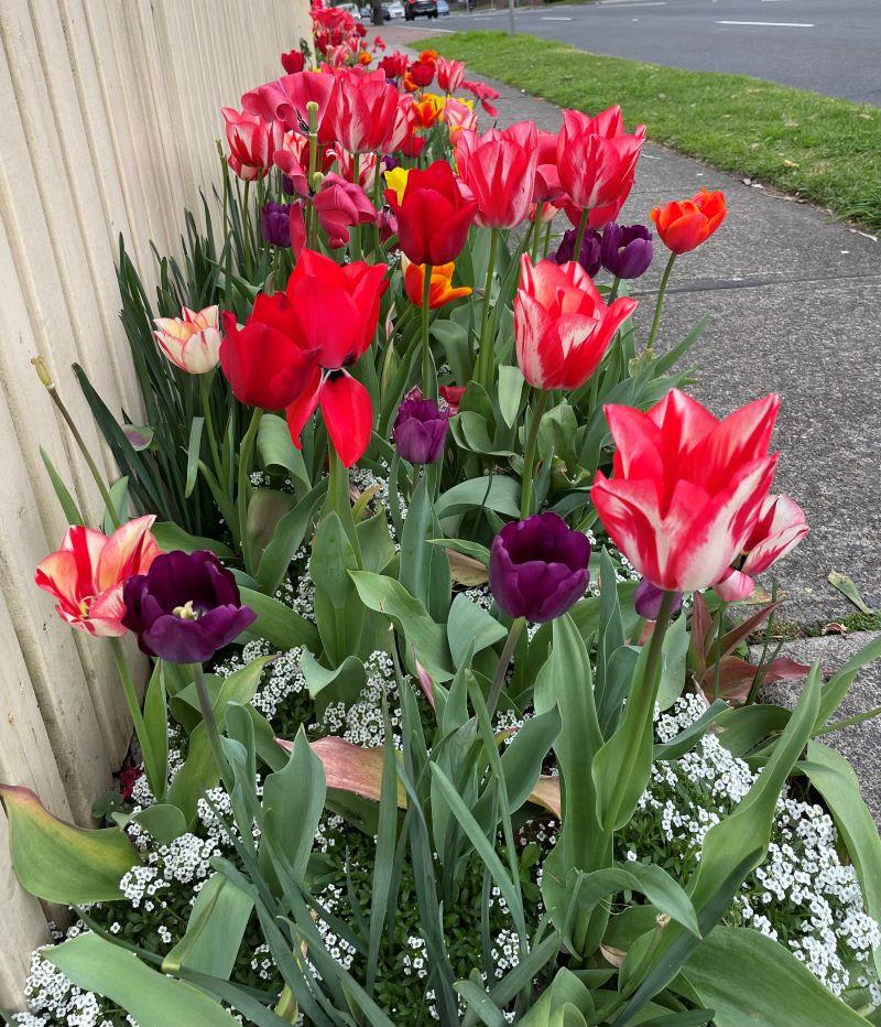 Place tulips in the crisper of your refrigerator until planting time. Prepare the soil in your garden bed by adding compost or soil conditioner from your garden centre. Sprinkle blood and bone, dolomite and sulfate of potash over the tulip bed and cultivate gently. If your soil is heavy, dig in horticultural sand to help with drainage. I overplanted my tulips with alyssum to suppress weeds and add a softness to the flower display.